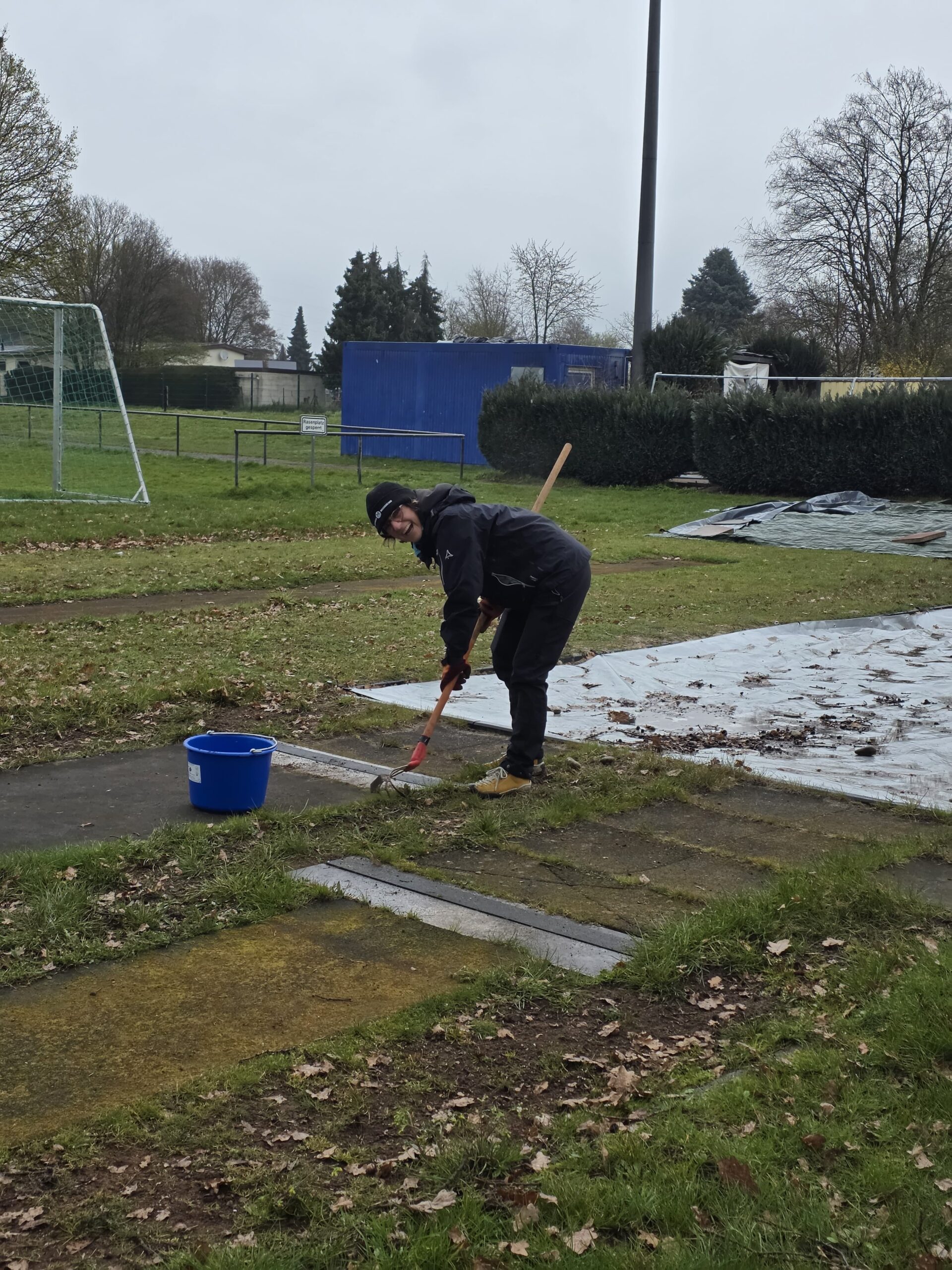 Auch die Laufbahn sowie die Anlagen für Weitsprung und Kugelstoß wurden – trotz durchwachsenen Wetters – gründlich gesäubert.